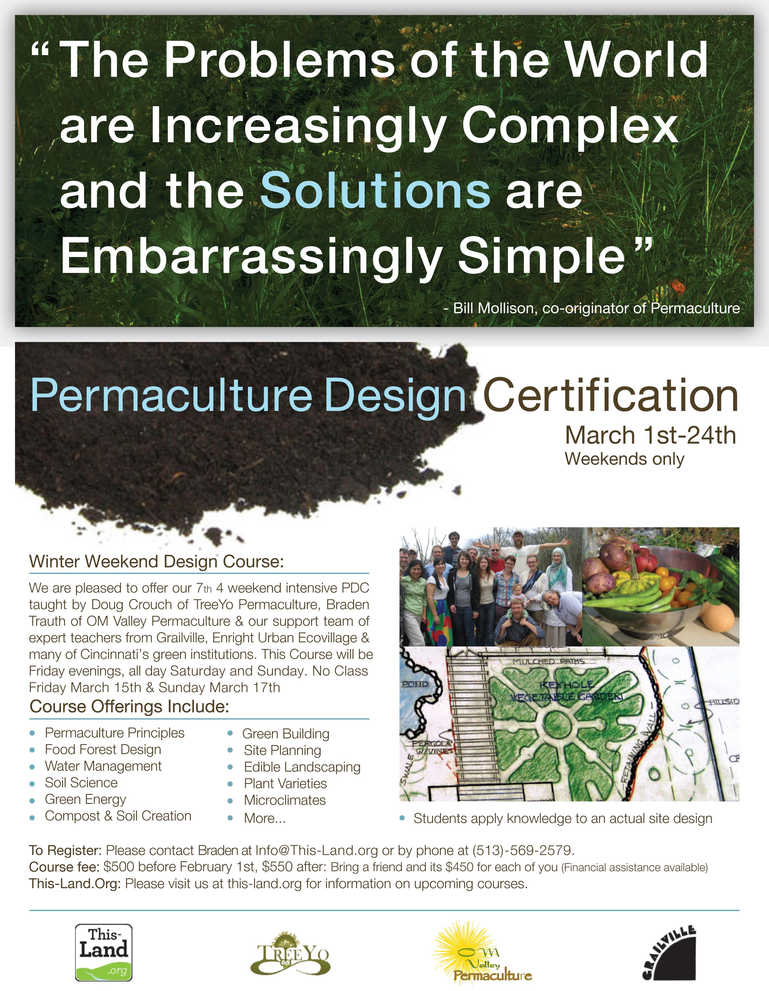 We are pleased to share with you This-Land.org’s 8th Annual Winter Permaculture Design Certification. This course will be teach you how to design and begin to implement the creation of a regenerative culture, the path of the next millennium. We will cover the basics of Permaculture design principles & methods, foundations of ecology, agriculture modeled after nature, Regenerative Building, Roof to River water management, Foundations of Renewable energy, Resilient Community design, Site assessment and design and much more. This course is taught by Braden Trauth of OM Valley Permaculture, Doug Crouch of Treeyo Permaculture and our crew of 12 teachers from Grailville, Enright Urban Ecovillage, Winddance farm and much more. This course is a life changing event and has impacted the lives of over 100 students in the O.M. Valley Region.