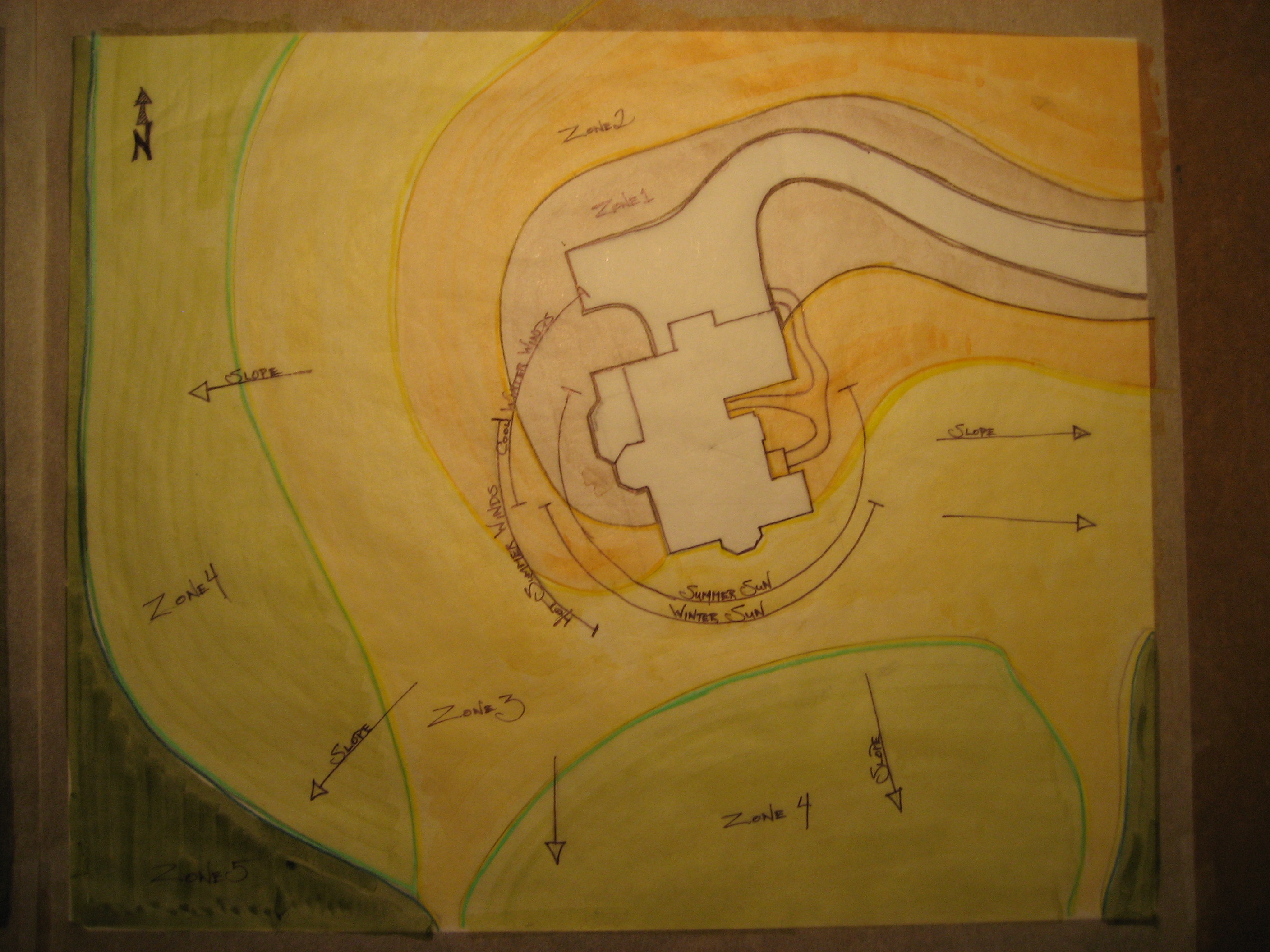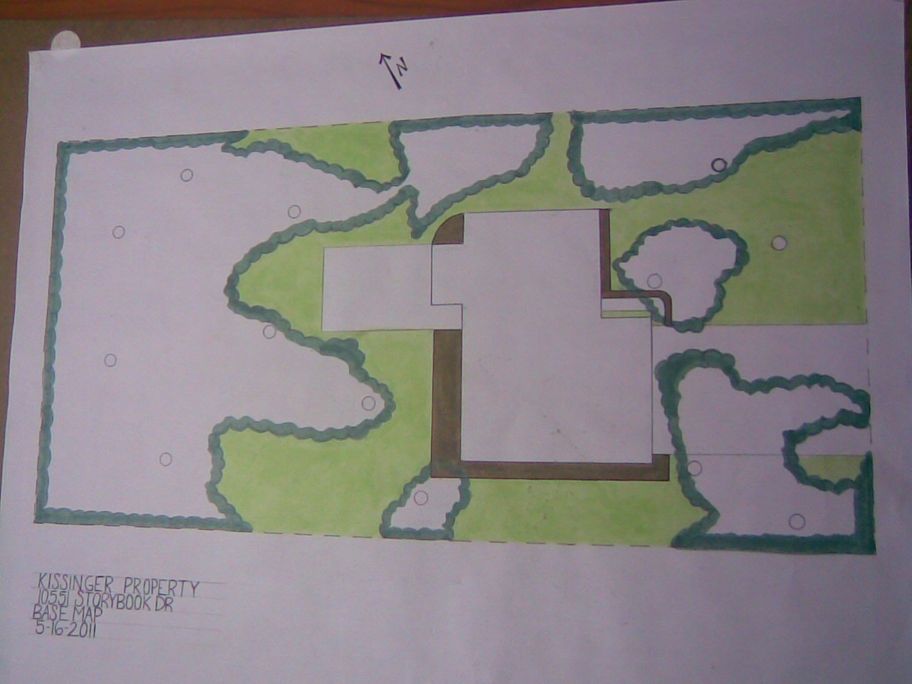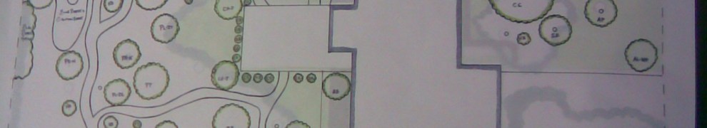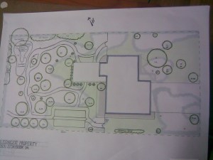 Base map of a suburban property laying out existing trees and cover for appropriate design of the edible landscape proposal